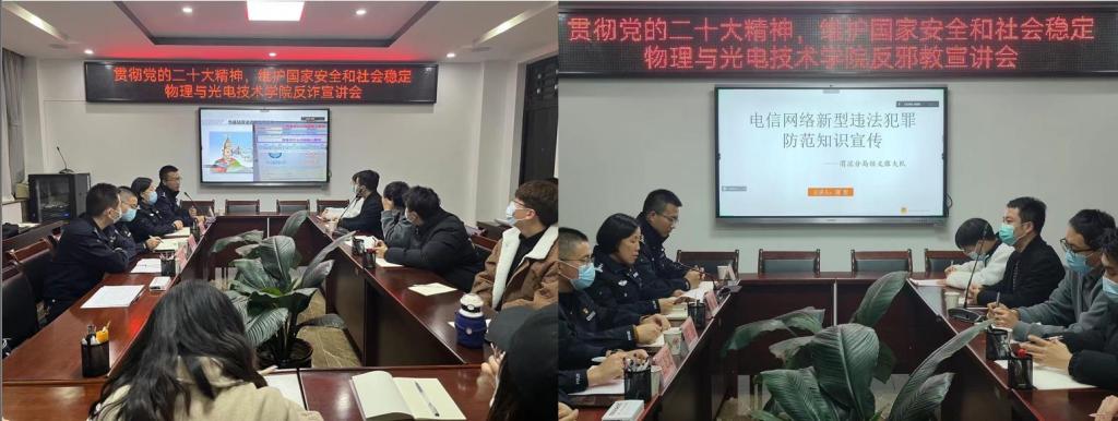 11月10日下午,太阳成集团tyc开展“贯彻党的二十大精神,维护校园安全稳定”反诈、反邪教宣讲会。会议采取线上线下多会场形式,300余名员工参加会议。学院邀请渭滨分局经文保大队队长贾蓓等4人参会并宣讲,公司党委副书记陈冠男参会,会议由艾保保主持。